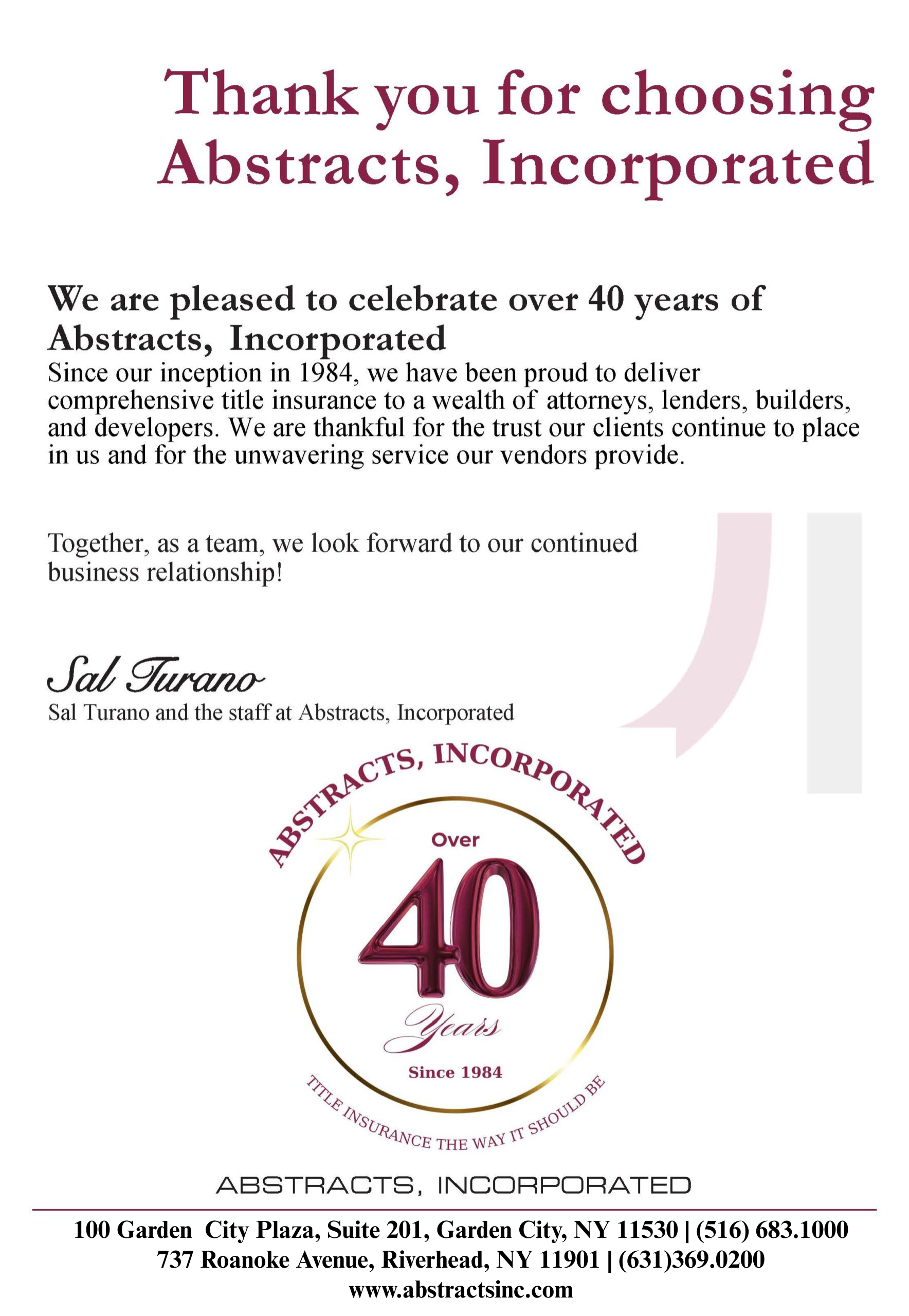 Established in 1984 by President Sal J. Turano, Abstracts, Incorporated has grown to become one of the leading title insurance agents in the Long Island and metropolitan New York area. Dedicated to a strong sense of industry ethics and excellence, Abstracts, Incorporated for decades has remained in the forefront of the title business. Abstracts, Incorporated is widely recognized for its broad knowledge and experience in all areas of title insurance and is well known to provide its clients with prompt and reliable title services.